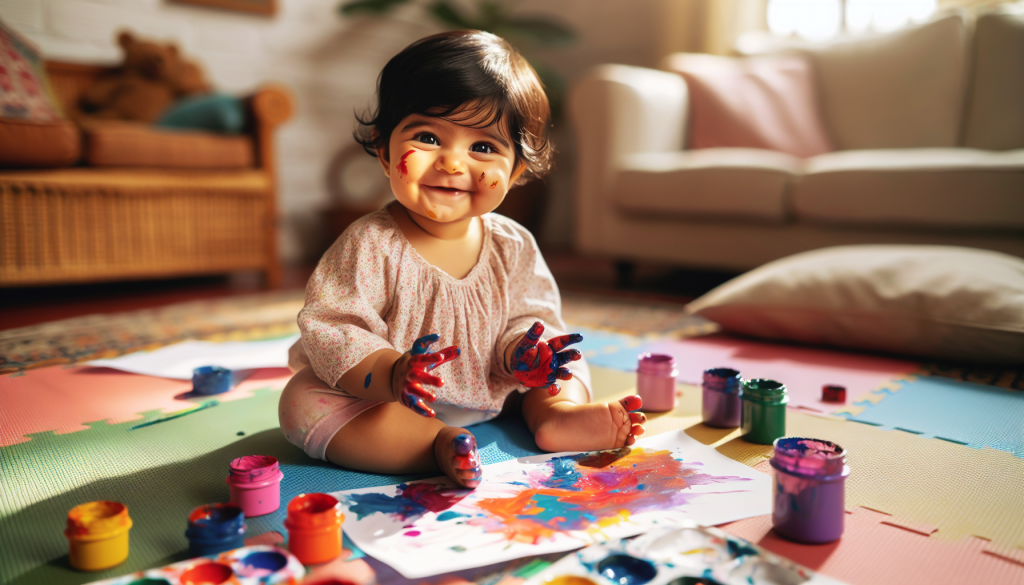 6. Music and Movement: Incorporate music and movement into your baby’s art experiences by dancing together with colorful scarves or ribbons, playing musical instruments like shakers or drums, or creating simple sensory bottles filled with colored water and glitter to shake and observe.